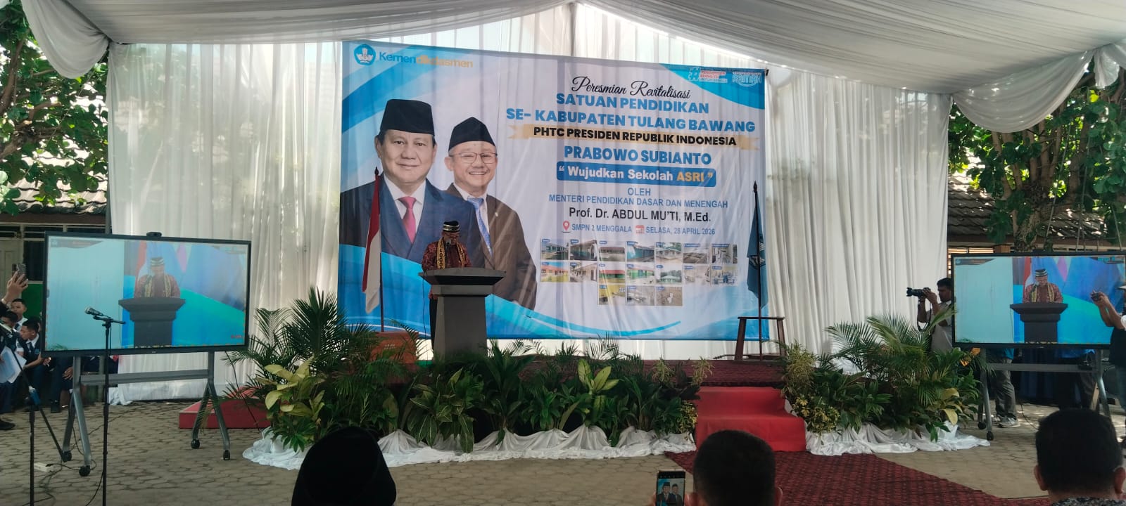Tulang Bawang — Peresmian Revitalisasi Satuan Pendidikan se-Kabupaten Tulangbawang melalui Program Hasil Terbaik Cepat (PHTC) Presiden Republik Indonesia Prabowo Subianto berlangsung khidmat dengan mengusung tema “Wujudkan Sekolah ASRI”. Kegiatan ini dipusatkan di halaman SMP Negeri 02 Menggala, Kecamatan Menggala, Kabupaten Tulangbawang, Selasa (28/4).